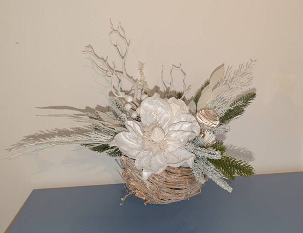 Weihnachtsgesteck aus künstlichen Christbaumzweigen und spezieller Weihnachtsdekoration, montiert in einem Korb.
