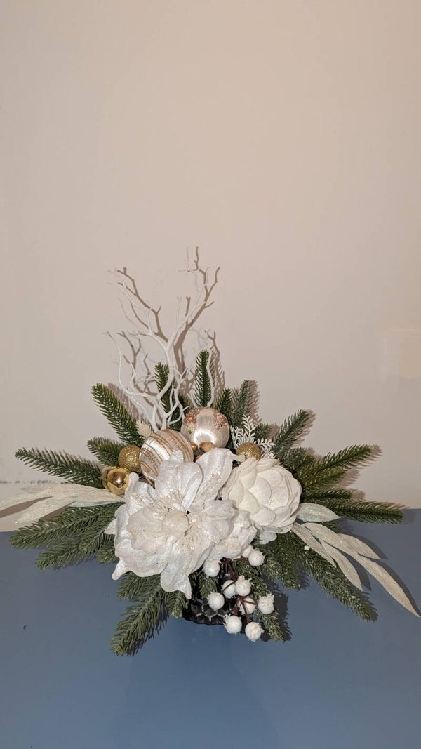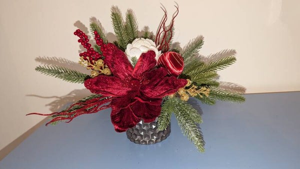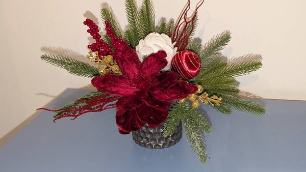 Kleines Weihnachtsgesteck, mit verschiedenen Farben. Die Unterstützung entspricht nicht der in der Präsentation. Das Arrangement wird in einem passenden Ständer mit dem Arrangement geliefert.